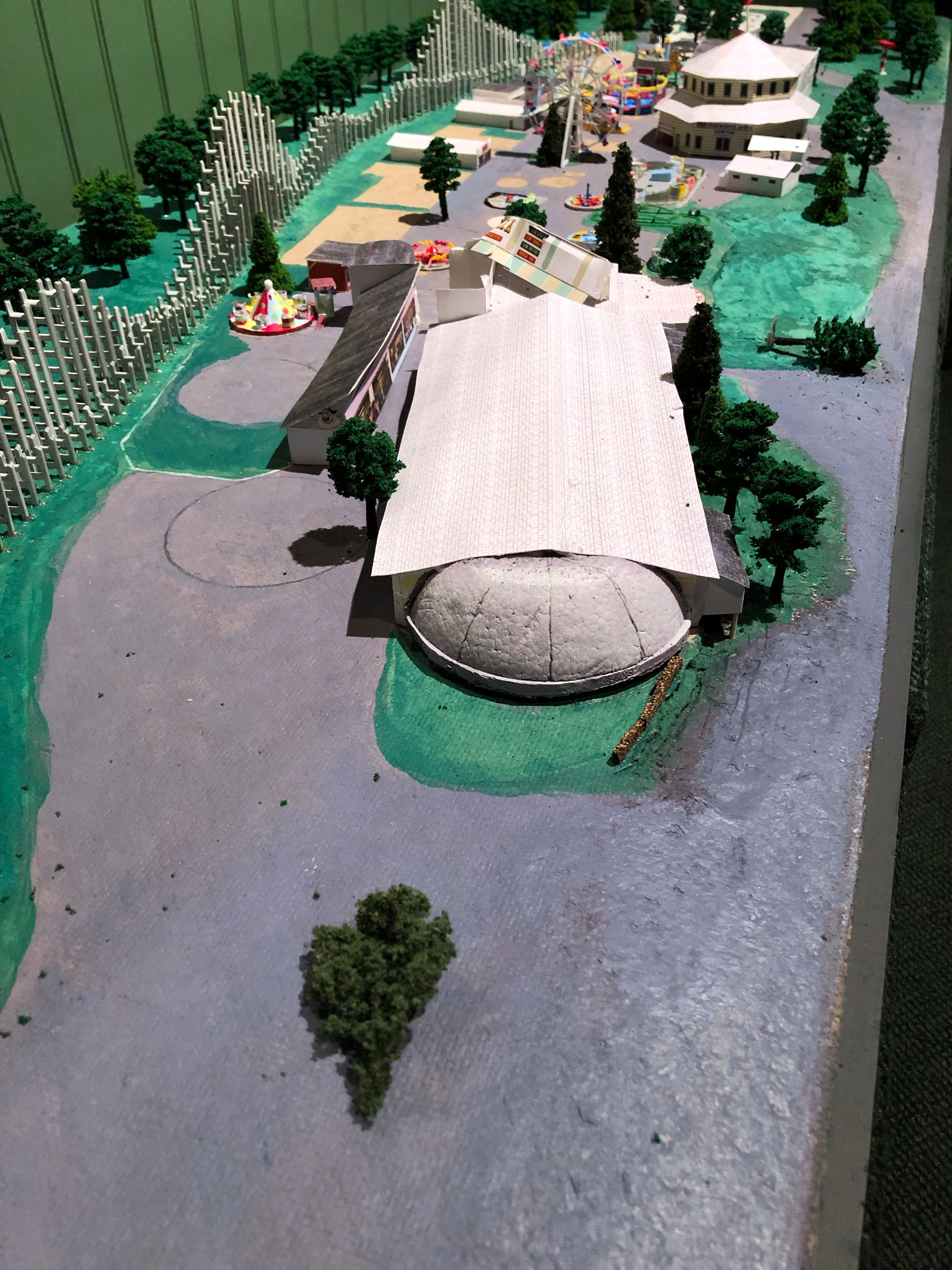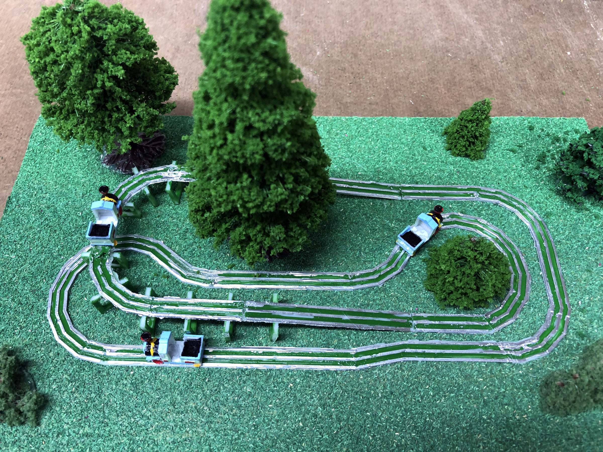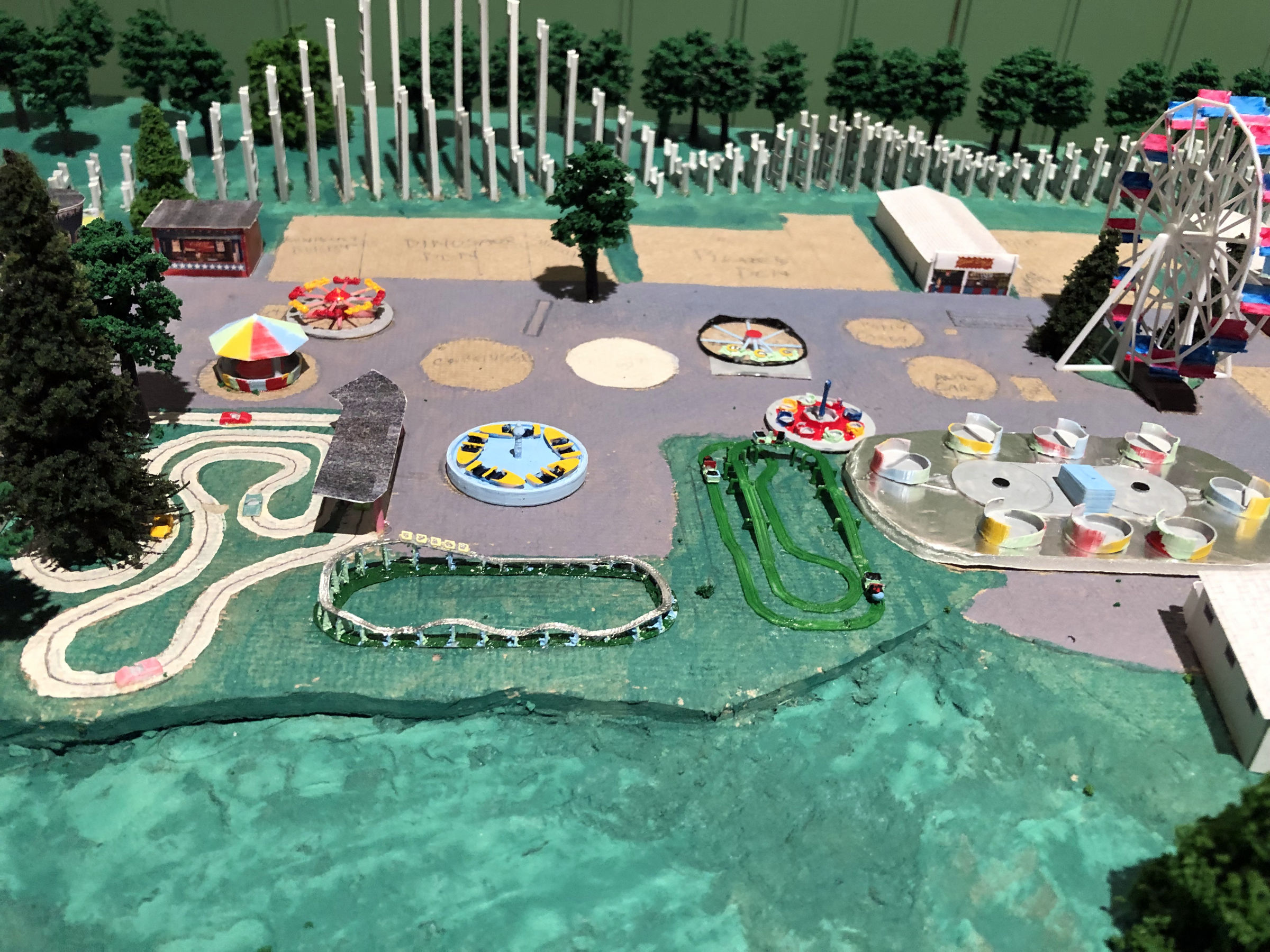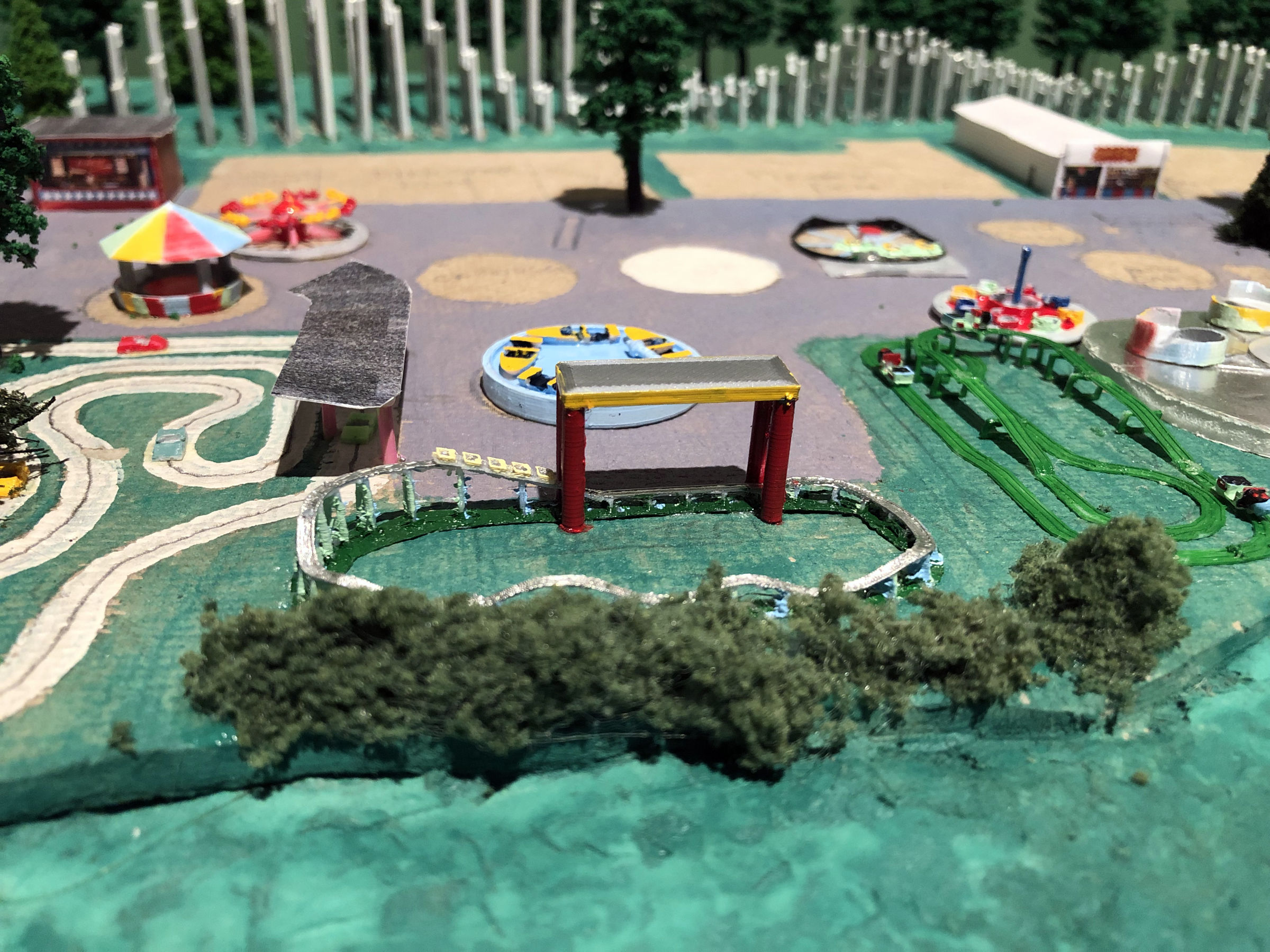 I started with a sketch that matched the footprint of the model. The pattern of the track was clever, a sort of curvy double oval that gave the sense of a much longer trip than it was. Like the Cutie Caddy and the kiddie coaster, part of the ride (the curve leading back to the station) was perched on the edge of the cliff overlooking the parking lot and as a kid it was always a thrill riding along that edge. The first part that I modeled was the train. The actual train car had a lot of curvy detail in it. But I left all that out of my model since it would never print. The train took me just a few hours to construct. I started the track with the straight piece that formed the station. I made the three rails out of elongated cubes and placed them on a flat surface so that they'd print. To make the curves, I used a duplicate of the straight piece but shortened it and then cut the sides at a 12-degree angle. That allowed me to fit the small sections together into a gentle curve. When I got to the inclines, I tilted the track up so that I could size the length correctly. I added the curve and the downslope and then finished off with the curve back to the station. Then I created the trestles so that they fit under the raised track. Once that was completed, I took apart the raised sections and flattened out the entire layout. That was how I would print it. Once again, the tiny scale proved to be a challenge with several of the smaller trestle sections refusing to print. When I finally got a decent print, I painted the track and trestles green. Then I painted the trains as best I could. When that was dry, I glued the trestles onto the upper track which would make the whole thing easier to install. With that done, I turned my attention back to the kiddie coaster. Knowing how poorly small detail printed, I approached this design with a more brutal aesthetic. I wanted to make all the parts thick, even if it looked unrealistic on the screen, because I knew that would print correctly. The original structure was lattice-like, which would have been unprintable. So instead I made the track more like a flume trough. I stretched and subdivided a cube in Blender which allowed me to bend it in any direction. Then I simply duplicated that cube over and over, curving it as I needed to. In a short time I had a complete circuit, Next I created an A frame and duplicated that, sizing and rotating each one as needed, until all the supports were done. They didn't look anything like the actual rather dainty supports, but again I needed them to print. My first printing attempt wasn't very successful. The track itself was broken in places. There was a lot of stringing and the supports were fragmented. So I went back to the drawing board and beefed up the entire structure. It looked ridiculous on the computer, but it actually printed pretty well. Try as I might, I couldn't get the train to print. I redesigned it to make it a bit thicker and I also added a thick bar through it, front to back, allowing me to line them up in my slicer program and print them out as a single train. But the printer couldn't handle something that tiny and extruded tiny formless blobs. So I ordered a new .2 mm nozzle for my printer (half the size of the default nozzle). It arrived in a few days, and the result was dramatically better. It still didn't look much like a train, but there was finally some discernable detail. Painting the pieces was fairly simple. The original coaster had a yellow track structure with pastel green and blue supports. But most of the yellow had been spattered with grease. The most prominent track color was the silver of the rails, so that's what I went with for the top. I left the raft on the base and painted it dark green, so that it would be easier to affix to the Homasote. Then I painted the train and glued it to the lift hill, and the kiddie coaster was done. While I was at it, I made a larger version of the Puffing Billy and attached it to a wood base with fake grass and trees. I planned to give it to Jay Collins at some point. It wasn't until mid-August that I made it back to Heritage Park to install the two rides. I still needed to figure out how I was going to make the station for the kiddie coaster. And I needed to make the pavilion for the Whip. And then I needed to decide what I would tackle next. There's a slight addendum to this portion: I had been working on the station for the kiddie coaster. It was too small to build out of toothpicks and card stock, so I once again turned to the 3D printer. On my first attempt, the legs were too thin and broke off. So as I did for the coaster track, I beefed up the supports and it printed fine. I painted it and brought it to Heritage Park in September. When I arrived, there was an unpleasant surprise. Evidently an unsupervised child had gotten a hold of the model and had torn up a few trees and the Pizza roof. Obviously, I wasn't too happy about that. Charlie wasn't around. I showed his assistant the damage and she wasn't very happy about it either. They needed that plexiglass cover to prevent further damage. Anyway, I glued the kiddie coaster station into place. It was a bit too tall, but from most people's viewing angle it wouldn't matter. Then I had the assistant help me place the wooden cover (which had been stored off to the side) back onto the model. It would remain safely out of view until they were able to properly protect it. |