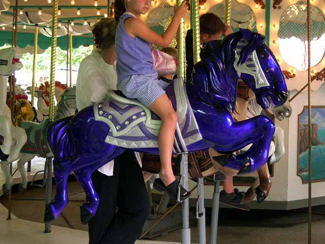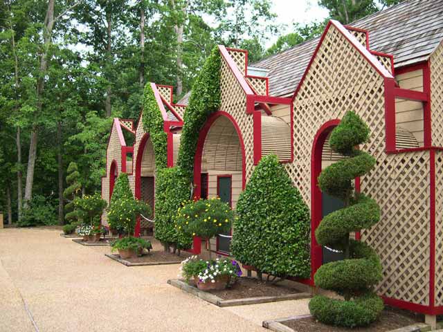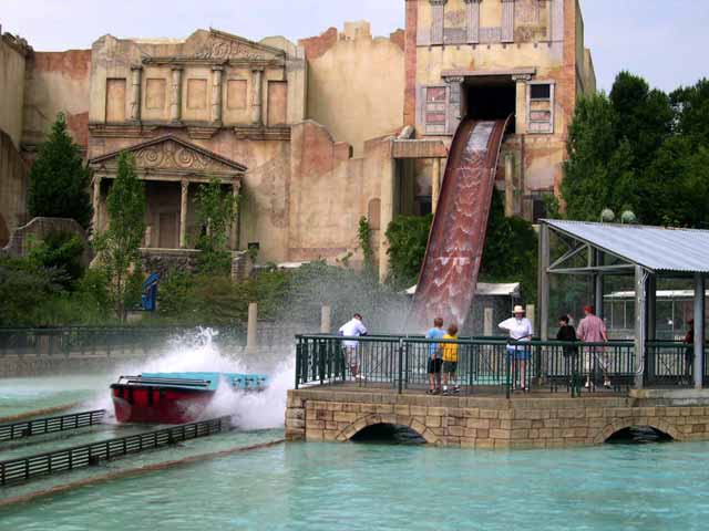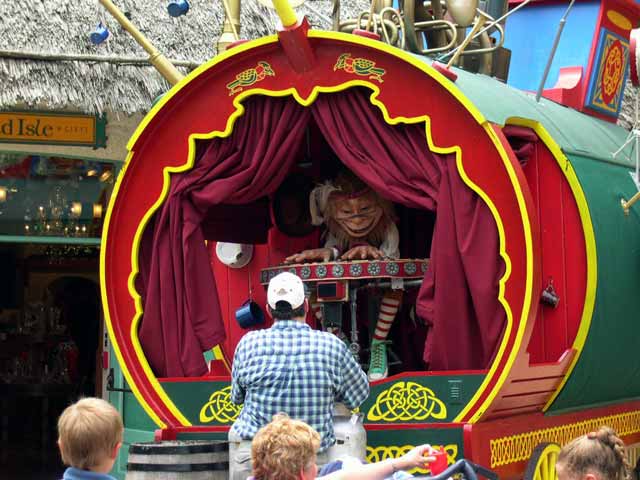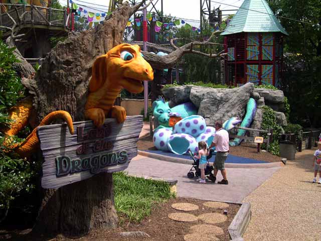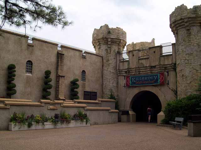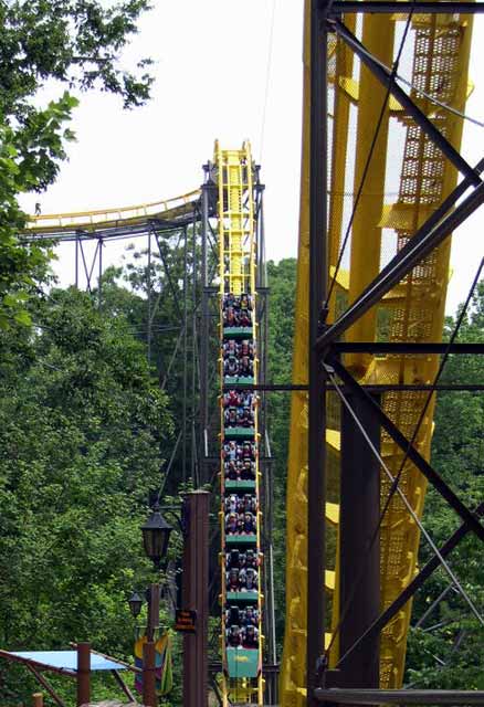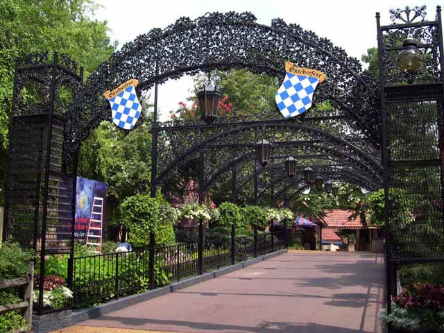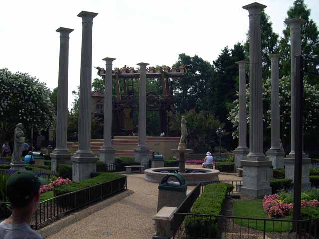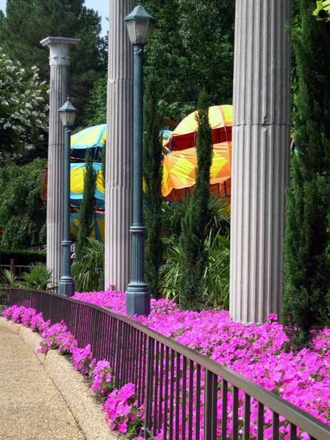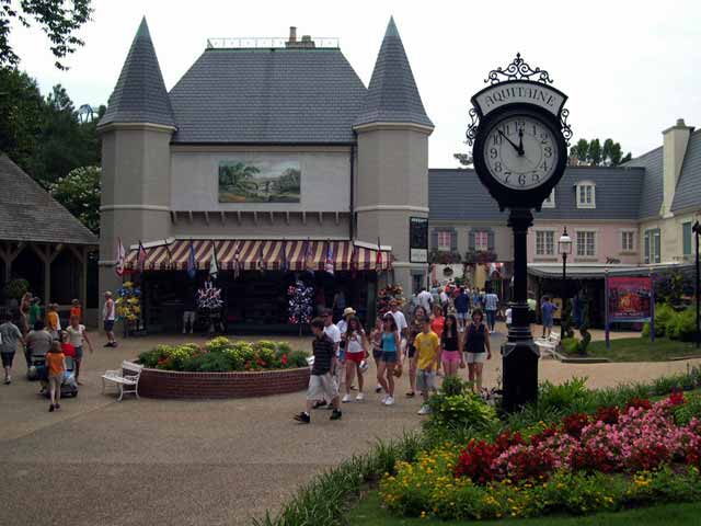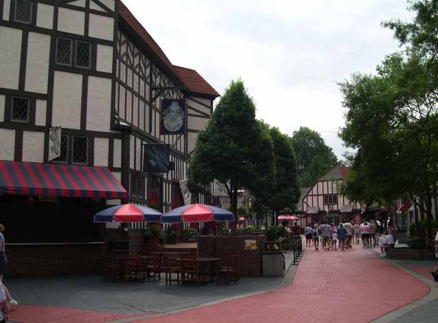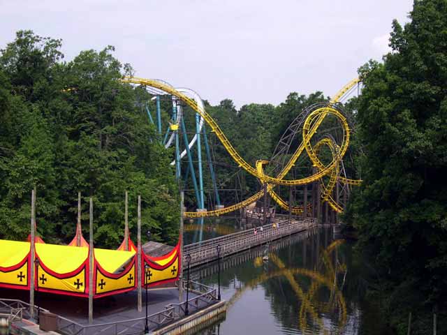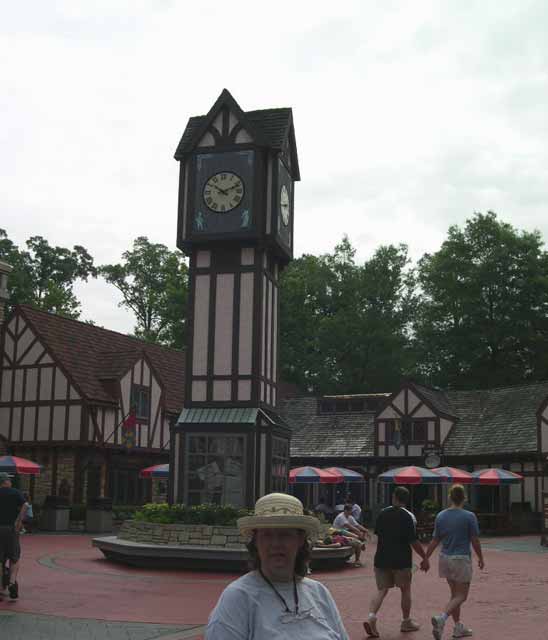 | On June 20th, Karen and I drove out to Williamsburg, Virginia, for three days at beautiful Busch Gardens. I thought it would take us around eight to ten hours to get there. I mapped out a route circumventing Manhattan, following route 87 south and joining up with I-95 in New Jersey. That was a mistake. Traffic was so thick and slow that after three hours we had traveled 86 miles, including a half-hour sitting in traffic at a New Jersey toll booth while cars continually cut into our lane. After thirteen hours of driving and about thirty dollars in tolls we reached our motel, The White Lion in Williamsburg, at about half-past midnight. The motel was set up more like a series of charming cottages. Our room was spacious, comfortable and quiet. It was perfect for two exhausted travelers. The next morning we woke up early and headed to the park. I had bought the park's "Summer Sizzler" passports online. They were a great bargain at only $65 each. We didn't have an interest in the water park and we weren't coming back for the rest of the season, so the Sizzler worked out well. The weather was perfect: the sky was bright blue, the temperature was in the upper 70s and the humidity was low. What a contrast with our trip from a few years ago when it was so hot and humid we thought we would pass out. The bright purple and yellow structure of Apollo's Chariot greeted us at the entrance. Preferred Parking went up three dollars since our previous visit. At $13 the price was a bit steep but it was still worth it. We got a space right in front of the entrance. That made trips back to the car much easier. There was an extensive queue line set up in front of the ticket windows. Two employees were efficiently herding guests to open windows. We waited no more than two minutes. Karen presented her online ticket. She was given the plain brown Sizzler ID card. Rather than take her photo like season passes at other parks, the ticket girl simply ran the card (which was black on the back) through a printer, which stamped a bar code on it. When I handed the ticket girl my online pass, she seemed puzzled for a moment and then looked around her booth as if she were missing something. She turned to me and said, "Um...I'm all out of Summer Sizzler passports. So go ahead and pick any one of these." She gestured to a row of sample cards in her window. I picked a rather stunning one that featured the Big Bad Wolf coaster. She ran my passport through her machine and off we went down the winding path to the entrance. Karen was a bit disappointed that she didn't get to choose a nicer pass. Since none of them seemed to indicate the type of passport and all the information was in the barcode, it didn't seem to make much difference which one was used. Letting guests choose their passport makes sense. Busch Gardens has such a beautiful entry way. I love how, after the ticket windows, there's no traditional entrance. We wandered among the beautiful floral displays. Ivy climbing along the buildings was trimmed into geometrical forms. Shrubs were pruned to form spirals. And there was that wonderful waterfall running along the left side. A pond with quietly floating ducks spilled down into another pond, which spilled down into yet another smaller pond which then sent water cascading down a steep hill and out of sight. The curving tan pebbled walkway diverted so that you could follow the path of the water until it disappeared beyond a weathered rustic wooden fence. Everything was draped under a thick canopy of trees. Before we ever got into the park, this section told us what we were going to experience: beauty and serenity. Performers will often have a warm-up act to get the audience in the right mood. This entryway is Busch Garden's warm-up act. I wondered about the pre-recorded music there though; there was a lot of british and american pop from the 1960s. It didn't quite seem to fit. The actual entrance had long lines at all the gates, but they moved swiftly. There were makeshift tables set up in front of the gates where three security guards were checking bags. But there were so many people pouring in, the guards would check perhaps one bag for every ten guests. When Karen gave the gate attendant her pass to swipe, the machine let out a loud beep. "Place your hand here and squeeze the posts," the attendant said. There was a little stainless steel box that had a right hand imprint on it and little posts between the fingers. She placed her hand on it and squeezed. "Okay, now do it again." Karen repeated the procedure and the machine beeped again. "You're all set," the attendant cheerfully said. I went through the same routine. The scanner matched our hand prints to our bar codes, so no one else could use our passes. Everyone with a passport had to place their right hand in the device before entering the park. Considering how poor most season pass photos are, this was certainly a better alternative. The workers at the gate were relieved of the verification process. I don't know how reliable those machines are; we didn't have a problem with them in our three days there. I also don't know if there are privacy issues related to them. (Where is my hand print stored and who has access to it?) I actually don't even know if it's registering a hand print. It reminded me of those silly old arcade machines that supposedly determined your "love level" when you placed your hand on them. We followed the simulated stone path up the hill to Banbury Cross, the old England section of the park. The path was poured concrete, patterned and colored to resemble red brick trimmed with gray stone. The tightly-spaced buildings resembled a stereotypical street in England around 1700. The buildings were all tudor style, with colorful stained glass windows. The tall clock tower in the center was the anchor-point for this section. As with the rest of the park, planters with colorful flowers were everywhere. Ivy crawled up the buildings. The place could have 