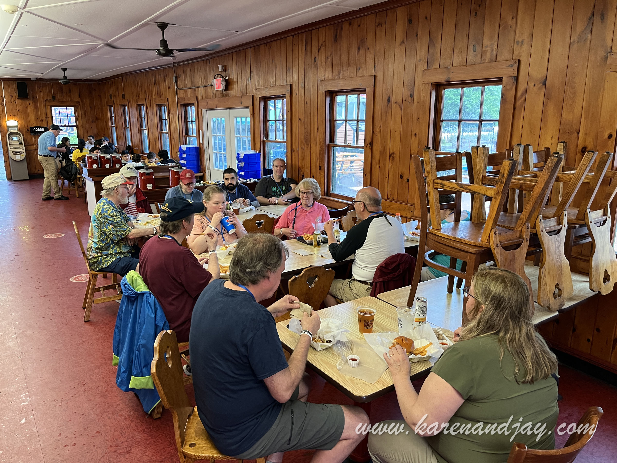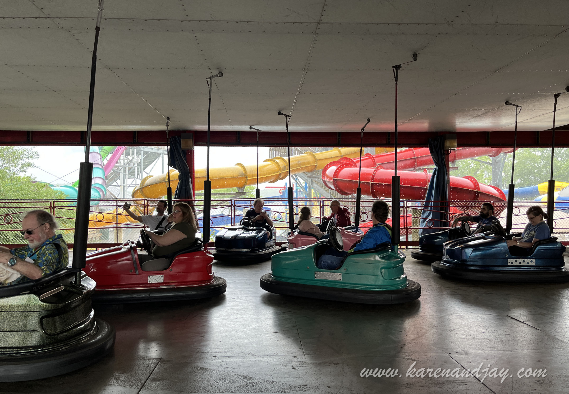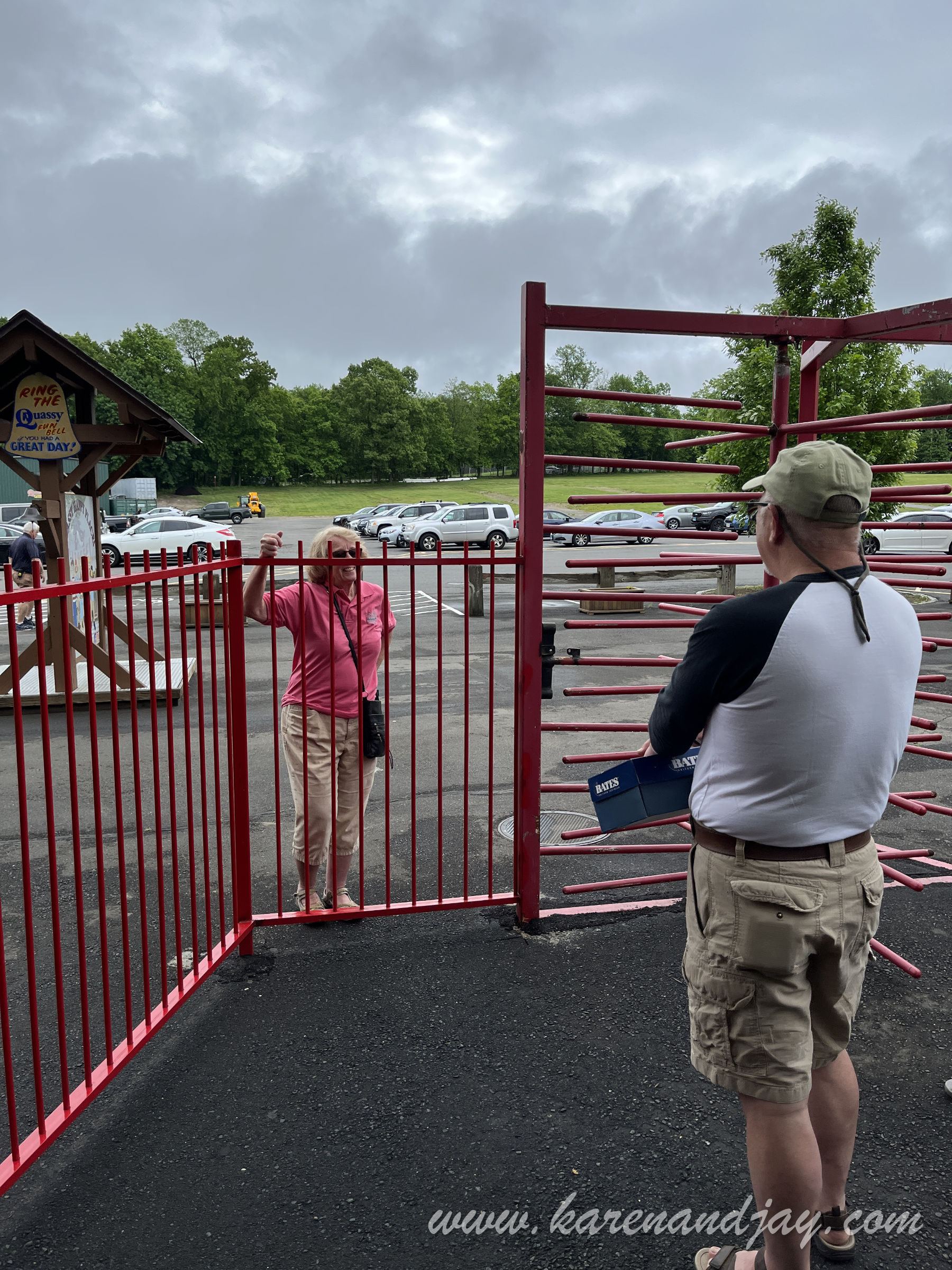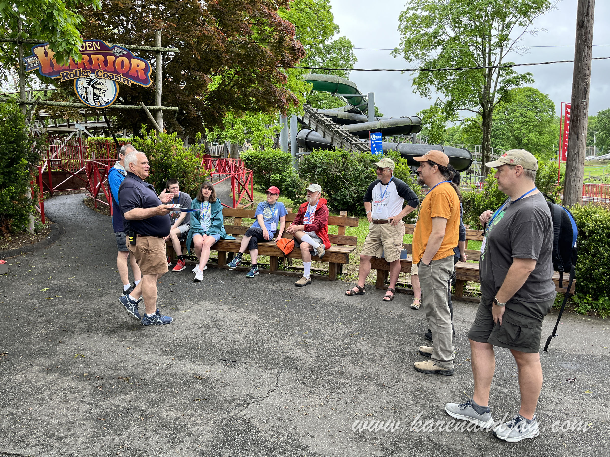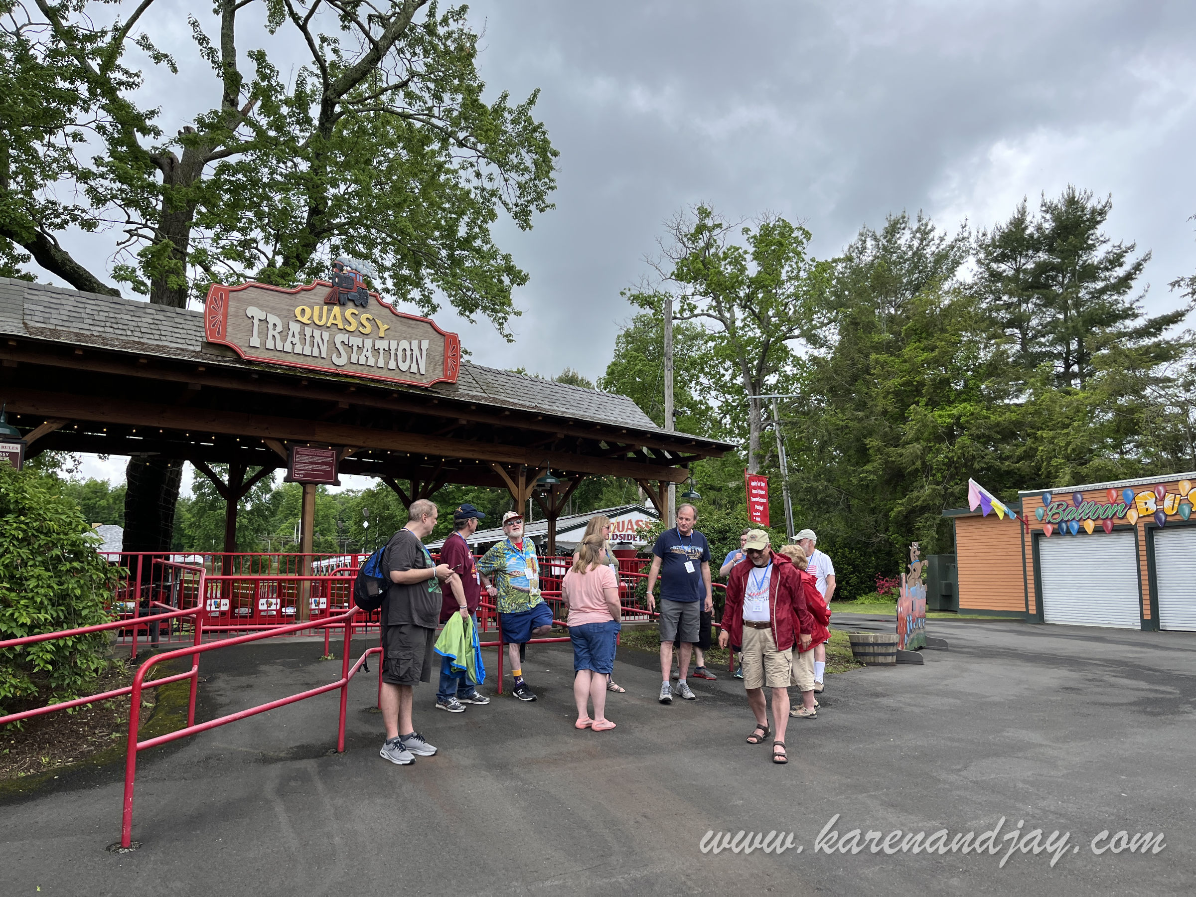 The kick-off to this year's Western New York Coaster Club's Coasterfest was close to home: Quassy Amusement Park in Middlebury, Connecticut. We hadn't been there since the park stopped hosting their annual Wooden Warrior Day event. The journey there was along peaceful back roads under threatening skies. The forecast was for severe thunderstorms. We were optimistically hoping that the weather might clear. Otherwise it would be our first Coasterfest washout. We arrived at the park about 10:00. There were already quite a few other cars there. The first thing I noticed was a new red metal fence that surrounded the entire park. Previously, you could just walk onto the midway from any place in the parking lot. The only entrance seemed to be a large vertical turnstile (like those revolving bank doors), but it only opened outward toward the parking lot. We both wanted to use the rest room but there apparently was no longer a way to get to it. The park now had gated entry, with no more ride tickets. Parking was now $10, but because we were meeting there for the event, we didn't have to pay. Bob and Yvonne Wheeler were managing the event for the WNYCC. We saw them near the fence and they told us to head through the ticket gates and then around. Unfortunately, there were fewer than two dozen enthusiasts joining us. So instead of a buffet lunch, the park was giving us food vouchers and we could eat whatever we wanted and when we wanted. We also didn't have an hour of ERT (Exclusive Ride Time) on Wooden Warrior, but instead Bob said we had ITOT (Informal Takeover Time)on the coaster, train and kiddie coaster at certain times throughout the day. In other words, we would just meet up there and ride together. George Frantzis II, one of the park owners, arrived and talked with us for a while. He mentioned the park's difficult decision to fence off the midway after over a century of free admission. He was going to let us get on Wooden Warrior a few minutes before the park opened. Because of the impending storm, he couldn't guarantee how long the park would be open. But he said that being by the lake, the bad weather often bypasses them. In any case, they weren't expecting a big crowd so we'd be able to get as many rides as we wanted, even after the park officially opened at 11:00. More club members began arriving and we congregated at the entrance to Wooden Warrior. Yvonne remained near the parking lot to direct people in. Frantzis gave us our wrist bands and our meal tickets. When all in the group were accounted for, we headed up the queue line to the Wooden Warrior station. The ride attendants were really friendly and engaging. I was glad that there were several club members joining us who were riding this coaster for the first time. The first group of riders was secured into the comfortable Timberliner trains and were sent off on their way. When they returned to the station, they were cheering and clapping. This was a coaster that never failed to delight. Karen and I were next in line for the front seat. It still surprised me how much speed the little coaster had and how much ejector air time there was. Every hill threw me out of my seat, but not in a violent and painful way. It was fun and exhilarating. The group was pleasantly surprised with how re-ridable it was. I went for another ride while Karen took photos. When the park opened to the general public (of whom there were few), Karen and I headed over to the always-enjoyable train. As we waited in the queue line, streaks of sunlight teasingly appeared across the midway, giving us hope for a milder day than what was forecast. The track layout was a giant square around the edge of the park's sports field and under the Wooden Warrior's track. Even though it was a respectably long ride, the park always had the train make two circuits. In the big Fieldside Pavilion next to the train station, there was a sizable party underway with peppy polka music playing. After our relaxing ride, Karen wanted a snack and I was thirsty. So we walked over to the park's rustic restaurant. She got onion rings and Diet Pepsi and I got a Gatorade. We didn't use our meal tickets at that point, assuming we'd have our meal later in the afternoon. After that refresher, I decided to make a park walk-thru video while the weather was still cooperating. As I got further into the walk-thru, rain began coming down at a steady pace. Since the park is relatively small (at 20 acres), it only took me a few minutes to make the video. And then I realized the club was supposed to meet at the train for some ITOT rides and a group photo. So Karen and I headed back over to the train just as the club members were dispersing. So instead we joined them for a ride on the Grand Carousel next door. Quassy originally had a rare Stein & Goldstein carousel. But decades ago when the park was financially struggling, they chose to sell the horses to collectors and replace the ride with a modern fiberglass one from Chance Manufacturing. It turned out to be a smart move, because that was able to keep them afloat as the management team brought the park into a new era. After that enjoyable ride, someone suggested that we head over to the bumper cars. So we walked to the opposite end of the park. There were just a couple of people on the ride so we queued up. And once that ride ended, we had the arena all to ourselves. And then the skies opened up. When our ride ended, the attendant asked us if we wanted to stay on, and we all agreed. The cars moved fairly slowly and they had big sponge bumpers, so there was no way to bump anyone with any amount of force. The arena had no island in it, so it was a free-for-all, although most of us kept going around in a counter-clockwise direction. When that ride ended, the ride attendant was replaced by someone else, and older gentleman who'd been with the park a while. He asked if we just wanted to stay on since there wasn't much else to do. We ended up with the longest bump